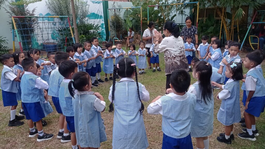 Kegiatan hari itu diawali seperti biasa dengan salam pagi dan berbaris rapi di depan kelas. Sapaan hangat dari ibu guru setiap pagi menjadi rutinitas yang sederhana namun penting untuk membangun kedekatan emosional antara guru dan siswa. Anak-anak belajar menyapa dengan sopan, membalas senyum, dan berlatih disiplin saat berbaris. Setelah barisan rapi terbentuk, anak-anak dengan antusias berjalan bersama menuju taman bermain, dipandu oleh guru yang selalu siap membimbing dengan sabar.