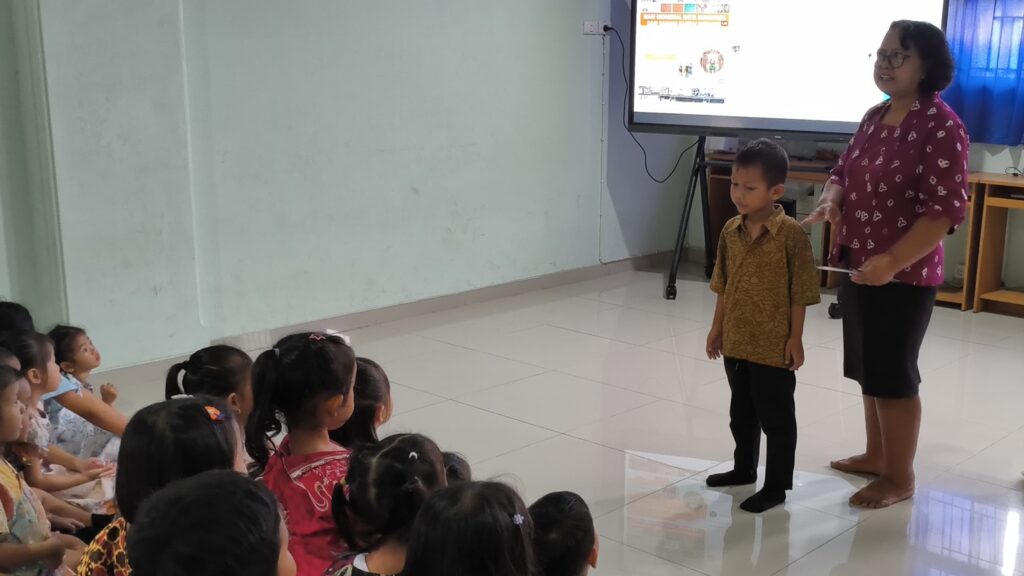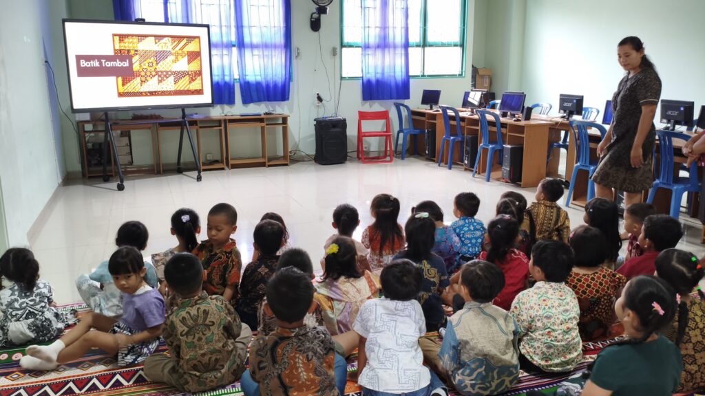 Untuk menambah interaksi, para guru mengadakan sesi tanya jawab seputar sejarah batik. Anak-anak tampak antusias menjawab pertanyaan, bahkan beberapa di antaranya berbagi cerita tentang batik yang biasa dipakai di rumah mereka. Setelah itu, siswa kembali menonton tayangan mengenai macam-macam batik dari berbagai daerah di Indonesia. Ragam motif batik dari Sabang hingga Merauke menambah wawasan sekaligus menumbuhkan rasa cinta tanah air. Kegiatan dilanjutkan dengan tanya jawab dari guru tentang jenis-jenis batik, kemudian diakhiri dengan penuh khidmat dengan menyanyikan lagu Batik Nasional bersama-sama. Suasana haru dan bangga terasa saat anak-anak menyuarakan lagu tersebut dengan semangat, seakan menegaskan betapa pentingnya melestarikan warisan budaya bangsa.